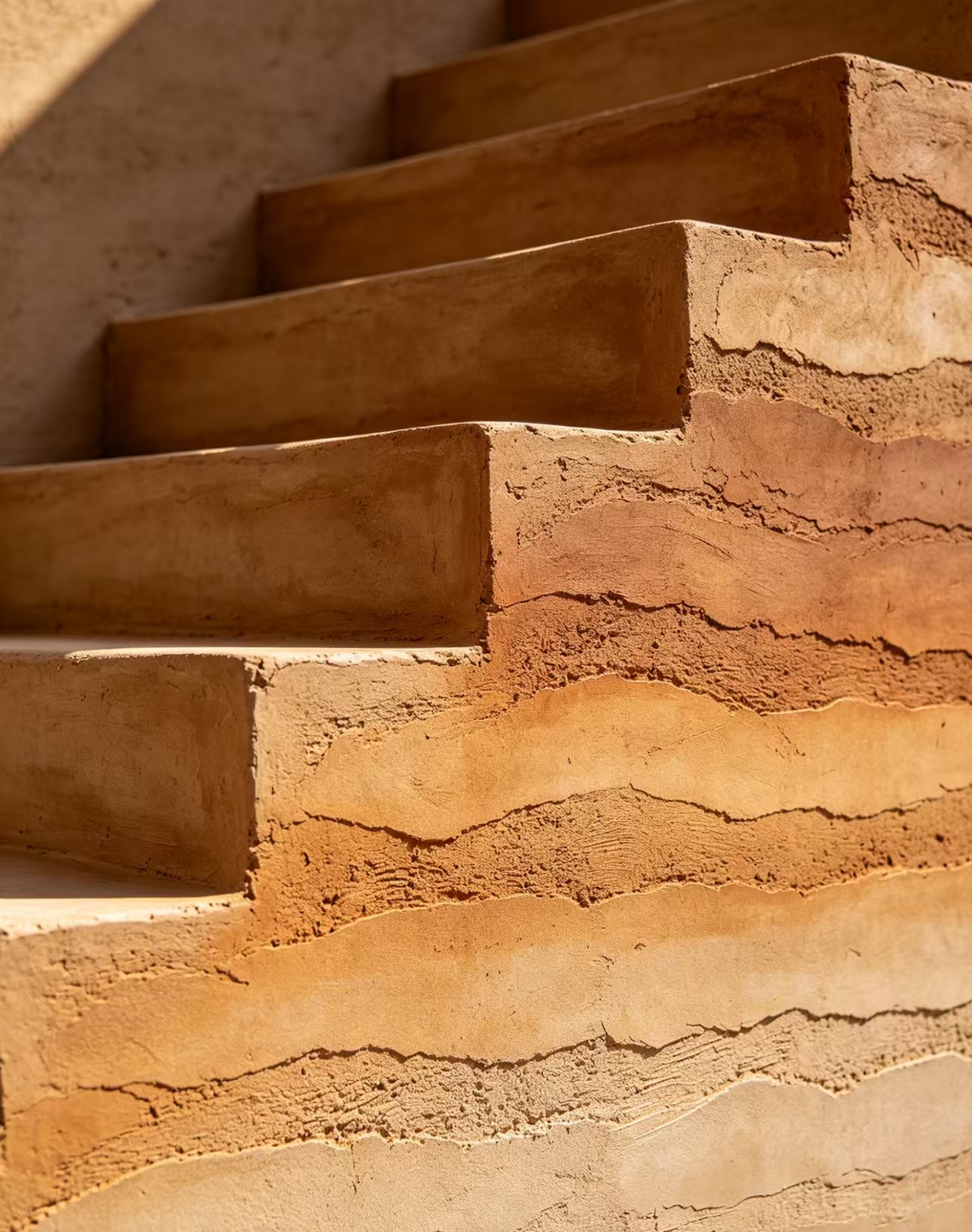 楼梯踏步、立面统一做夯土擦色处理,整体风格协调统一,大地色系耐看百搭,光影下肌理层次细腻柔和,让民宿楼梯告别单调冰冷质感,自带山野松弛氛围感,助力提升民宿空间辨识度与入住体验。